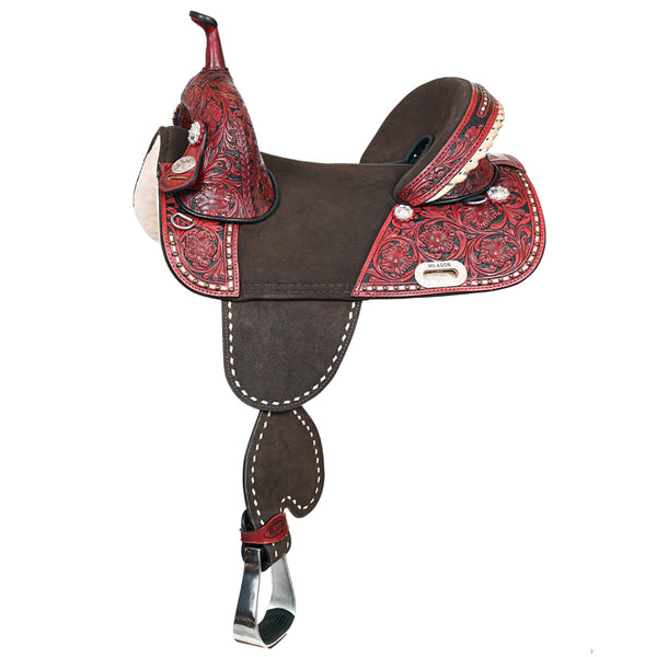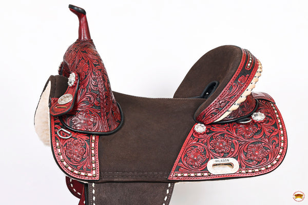 This treeless saddle is fantastic! The American leather is high-quality and the hand-tooled design is beautiful. It fits my horse perfectly and provides excellent comfort and flexibility. Great for trail and barrel racing. Highly recommended!